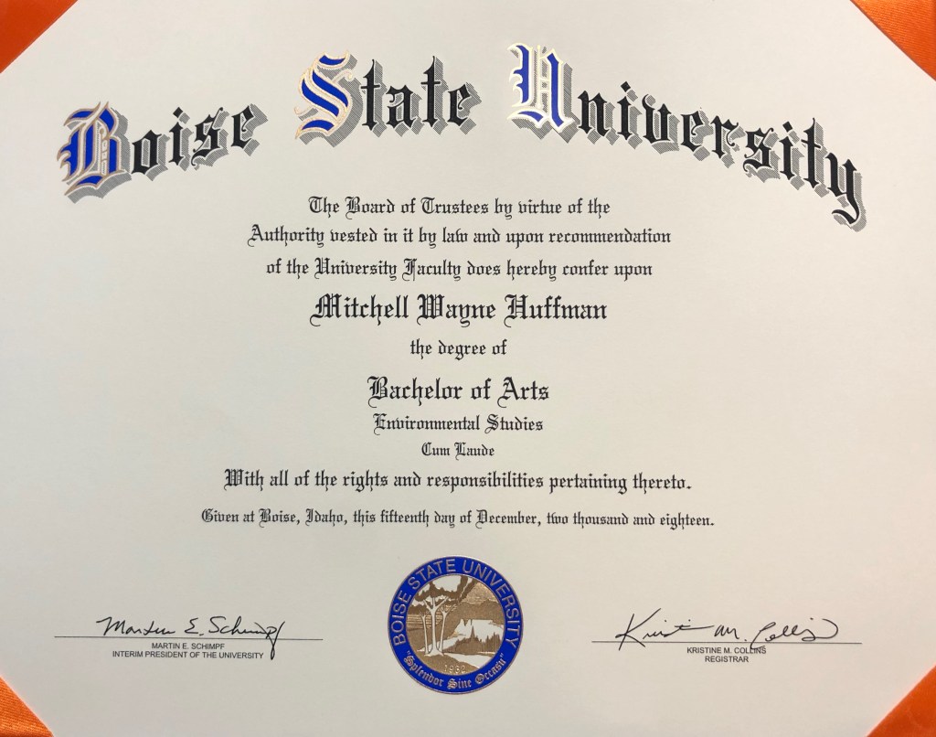I’m an Environmentalist with a passion for helping people and the Earth. I hail from the West Coast (west coast best coast) and even did a 9-year stint in Alaska. Avid backpacker, explorer, pin collector & ally to all humans and animals. Graduated from Boise State University (just wanted to show off my diploma). Links to my social media accounts are below. My CV is also shown below.